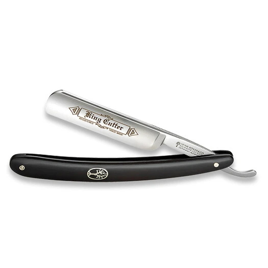 With the Boker King Cutter Stainless the most popular razor from our range is finally available in a stainless steel version. The 5/8 inch wide blade with round head and serrated on both sides is less maintenance-intensive and is of course also manufactured with extra hollow blade grinding with ridge in the Boker Knife Manufactory in Solingen. As befits a king razor, the black plastic handle has a noble inlay of nickel silver, which is inserted into the handle in elaborate manual work. With authentic Boker stamp in the blade passage, certificate of authenticity and historical packaging.