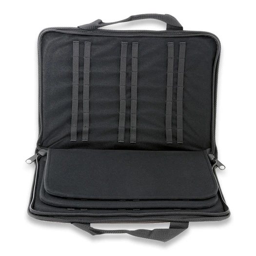 Dimensions: 305 mm x 381 mm. Brown handle. Case logo imprint. Thick foam padding and center separator to protect knives on each side. Perfect for storage, travel or display. Holds approximately 60 knives. Brown zippered storage case.