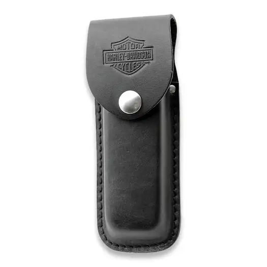 Black leather with Harley Davidson logo. Snap closure. Fits 140 mm folding knife. Bulk packed.
