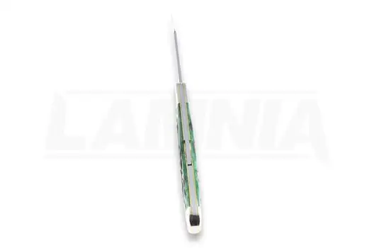 Pocket worn Bermuda green jigged bone handles with nickel silver bolsters and inlay shield. Handles are hand-finished to give them a comfortable, slightly smoother “pocket worn” feeling.