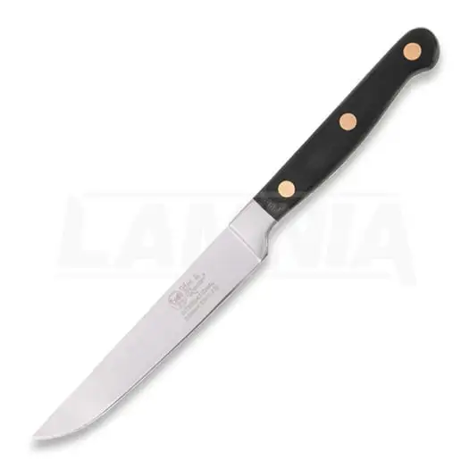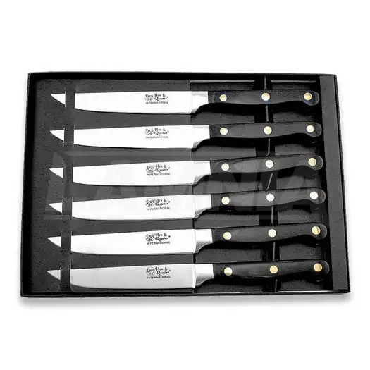 9.25″ overall. 5″ satin finish 440 stainless blade. Black wood handle. Stainless bolster(s). Full tang. Set of six.