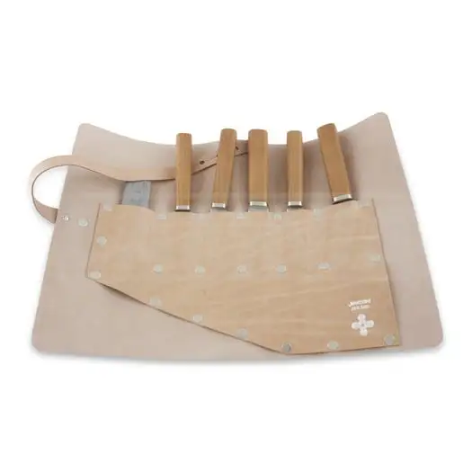 The Cabin Chef set, designed by Harri Koskinen, has the essential knives for the camping and cabin kitchen. The meticulously clean lines of the knives are designed to serve function and ergonomics. The harmonious combination of beautiful design and practicality, as well as durable natural materials, guarantee that the Cabin Chef knives are a pleasure to use, time and time again.