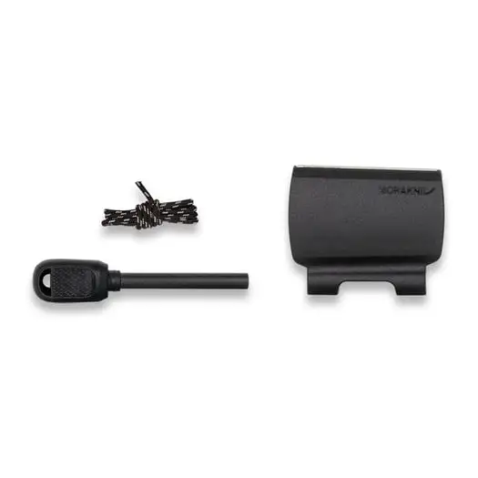 The Survival Kit consists of an integrated, high-quality fire starter and a diamond sharpener that serves you the opportunity to light a campfire and sharpen the knife when you need it. The new accessory is also equipped with a reflex paracord that can be attached to the fire starter.