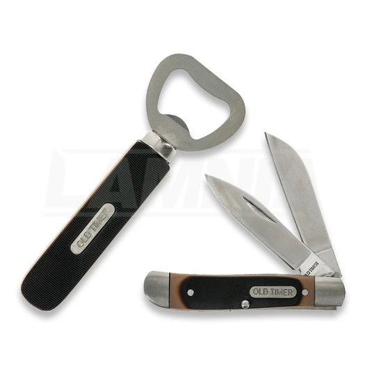 Old Timer. 3.13″ (7.95cm) closed. Satin finish stainless spear and spey blades. Sawcut Delrin handle. Stainless bolster(s). Inlay shield. Includes 4.5″ overall bottle opener with sawcut Delrin handle and stainless opener.