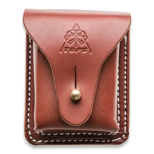 Dimensions: 1.75″ x 2″ x 3″. Brown leather construction. The perfect compliment to any bushcrafter’s kit.