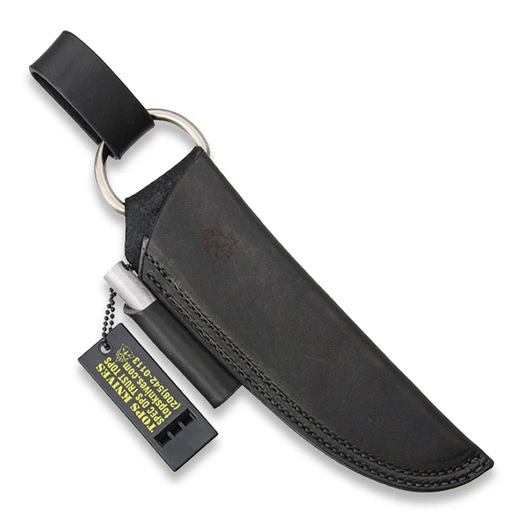 Embossed black leather American Steerhide belt sheath with stainless D-ring, snap over strap and side slip pouch for storing your fire starter. Vegetable tanned. Fits Brother’s of Bushcraft (BROS-01), Dragonfly 4.5 (DFLY-4.5), Hunter of Gunmen 4.5 (HOG-4.5), Mohawk Hunter (MKH01), Shango-XL (SHGO-XL) and Spirit Hunter (SHR-01). Includes 70 mm overall black TOPS survival whistle and 79 mm overall fire starter with 51 mm rods. Bulk packed.